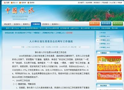 修水县委县政府网站上刊登的该县近年计生工作报告。网站截图