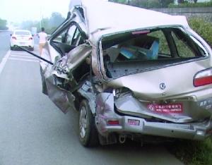 被撞的面包车左侧前挡风玻璃有个圆形裂纹,左后侧已成了一堆废铁。