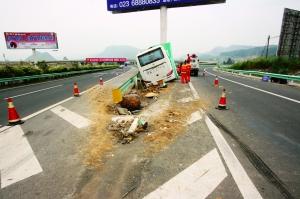 现场旅游大巴车公司一工作人员说,这辆大巴车核载39座,事发时车上只有20多人。“除几个受伤者和一名取消行程的男子,其余人员均已转乘公司另派的车辆前往重庆。另外,受伤的“没什么大事,都是轻微的擦伤。”