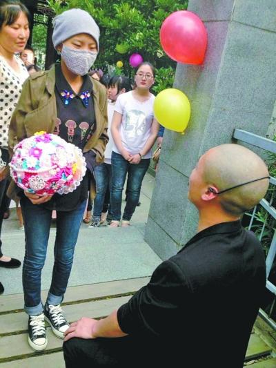 由于罹患白血病,近两个月来,20岁的吴榜燕一直在协和医院接受治疗(本报5月3日A3版报道)。在其患病期间,男友吴天尧一直不离不弃并在昨天突然求婚,令女友感动落泪。
