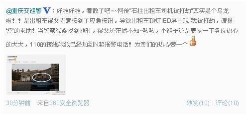 昨日傍晚,重庆石柱警察局接到多起报警电话称,一出租车顶灯LED屏出现“我被打劫,请报警”的求助信息。今日重庆市公安局交巡警总队官微证实此打劫系乌龙事件。