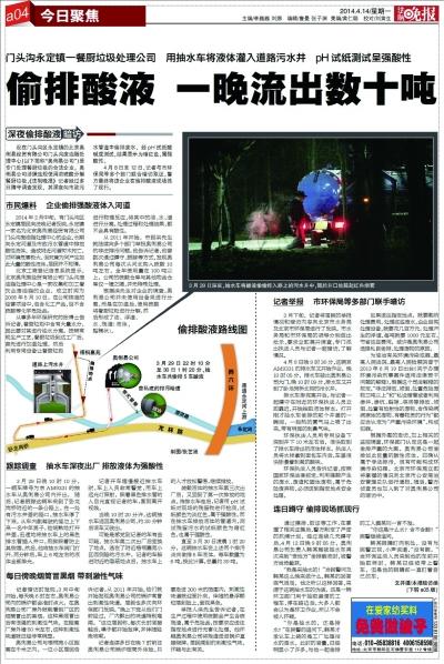4月14日,本报以《偷排酸液一晚流出数十吨》、《责令停产警方控制偷排人》两个版对此事进行了曝光。