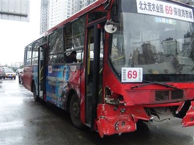 今天(25日)13时40分,在哈市绥化路与复旦路交汇处发生一起交通事故,一辆水泥罐车与一辆69路公交车相撞,公交车内2人受轻伤。