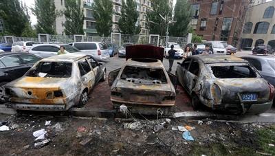 记者赶到南直路与长江路交汇处的盟科视界小区外侧看到,过道两侧停放着数百辆私家车,其中三辆车已被烧成了空壳,包括一辆宝马、一辆捷达还有一辆奇瑞QQ。在这三台被烧成空壳车的左侧,并排停着3辆轿车,这几台车尾部也有被火烧过的痕迹,其中一辆本田轿车及一辆奥迪轿车尾部被烧严重,本田轿车后保险杆已被烧变形,另一辆尼桑轿车尾部也有被烧的痕迹。