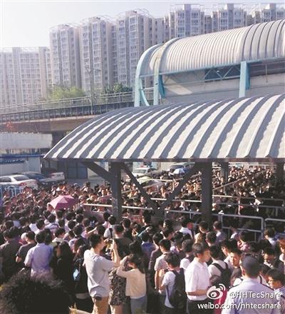 昨天早高峰,地铁龙泽站外等待进站的人群排起长队 供图/网络