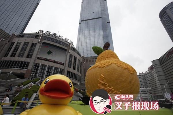 图说:港汇广场门口的大鸭梨上,小黄鸭被拔去大半。新民网 萧君玮 摄