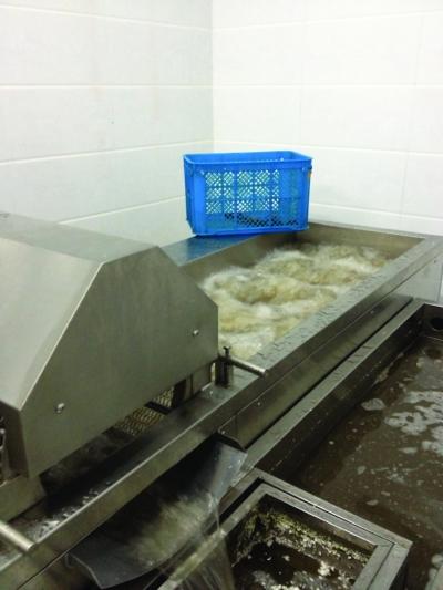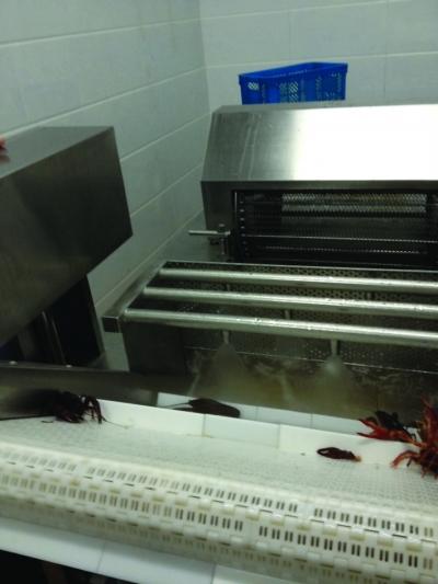 这期间,除了一名工人将龙虾倒进水槽里,传送带下方再放一个干净的空筐外,所有的环节都是由这台机器完成的。而记者检查了一下清洗后的龙虾,果然很干净。