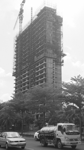 5月29日上午,记者来到位于凤翔东路的迈瀛村村口,远远就能看到旁边这栋高达23层的大楼以及比楼体略高的黄色塔吊。大楼主体结构完整,下半部分的脚手架已经拆除,露出灰色的钢筋混凝土结构,但12层以上仍然被包围在脚手架中。记者注意到,原本裹着脚手架的绿色安全网破损严重,所剩无几,脚手架上铺设的竹制脚手板摇摇欲坠。这栋楼前方是凤翔东路,右边是一家酒店,左边是迈瀛村大门,后面紧挨着一排民房,附近人来人往。