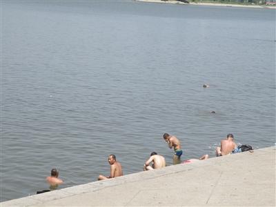 12时,记者来到松浦大桥,正赶上很多来野浴的人在江边的堤坝上野餐,正在吃饭的刘大爷说:“我们都11点半左右来江边游泳,这时候水温暖和,游一会上来正好吃午饭。”