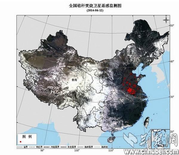 图为:全国秸秆焚烧卫星遥感监测图(2014-06-12)