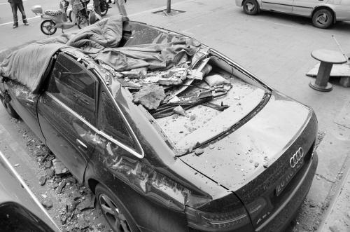 在墙体脱落的下方,一辆被砸得严重变形的黑色奥迪车格外显眼:这辆车牌显示“辽C”的奥迪轿车,车顶完全瘪了,后挡风玻璃整体脱落到地面上,摔得粉碎。驾驶室被砸得严重变形,顶棚深深塌陷入车身。尽管不知是谁把一床棉被蒙到车身上面,但车顶及四周遍布的墙体碎块,仍无言地讲述着脱落时那惊心动魄的一幕。