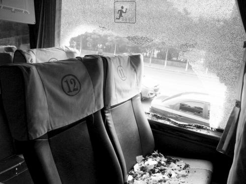 大客车窗破碎的位置位于车辆左侧,驾驶员身后第五个车窗,附近第四、六排的座位上也堆满了碎玻璃。“受伤的是两位50多岁的女士。”乘务员李女士惊魂未定,她告诉记者,就是因为坐在靠过道位置的王女士看到撞车后一把拉住靠窗户的陈女士,俩人才都受了轻伤,如果当时俩人都在睡觉,后果不堪设想。