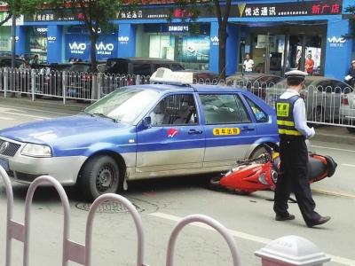出租车急转弯 小摩托来不及躲闪一头撞上车主受伤