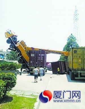 吊车失去平衡车头翘起无法动弹 疑操作不当(图)