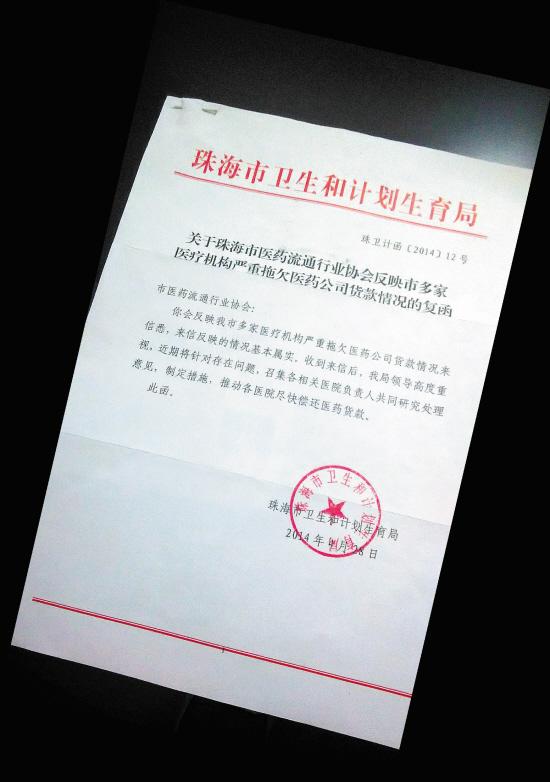 因药企被公立医院欠款严重,今年4月1日,珠海市医药流通行业协会通过珠海市政府信访办,以行业协会文件的形式,致函珠海市分管医疗卫生的副市长龙广艳,反映以上情况。苏韦锟向羊城晚报记者出示了珠海市卫计局对此事的复函(复函时间为4月28日),珠海市卫计局在复函中称“来信反映情况基本属实”,并表示“收到来信后,我局领导高度重视,近期将针对存在问题,召集各相关医院负责人共同研究处理意见,制定措施,推动各医院尽快偿还医药货款。”苏韦锟说,卫计局相关负责人告知他们,当时卫计局专门组织涉事医院相关负责人开会,对此进行协商与督促。