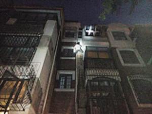 前天,一名在小区里施工的工人沿墙体从楼顶往楼下爬时,不慎被困在3楼和4楼之间的位置。
