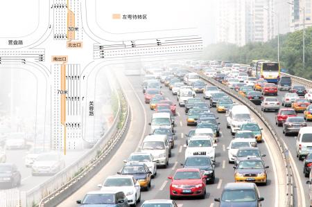 南出口 车道有4条,将靠近中央隔离护栏的一条出口车道设置为左弯待转区,待转区长为70米。车道有4条,将靠近中央隔离护栏的两条出口车道设置为左弯待转区,待转区长为30米。北出口