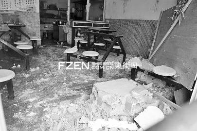 昨天11点20分左右,记者来到金冠花园阿秀小吃店,小吃店的卷帘门紧锁。记者透过小吃店的玻璃门往里面看,发现两张桌子的桌面已经不见踪影,碎片满地都是,圆形的椅子被砸变形,现场还有两块混凝土砖块。“这两块东西起码几十斤,要是砸到人,后果不堪设想,肯定会出人命的。”在场围观的林先生说。