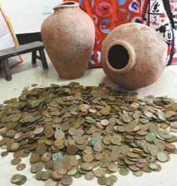 文物部门在现场勘察后,在已出土的陶罐附近几米的地方又挖掘出土了2个陶罐,一个是完好的,另一个已经破碎。邱光前介绍,出土的钱币约有几百斤重,用了16个编织袋才装完,初步估计钱币总数约有12000枚。