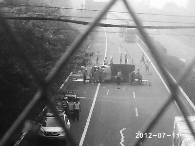陶先生是孝感人,当时他在高速公路的天桥上目睹了此次车祸的发生。他说,运猪的车当时在路上打了几个滚,侧翻压住一股车道,留下了一股车道,因此没有造成堵车。翻车后驾驶室一人被甩出车外一动不动,司机则被挤压在驾驶室内。货车上估摸有10余头约300多斤的大肥猪,事发后车上还剩下一头猪,有4头猪当场死亡,其他的活猪则在高速公路上逃窜,一些车辆不得不停下来躲避。