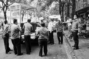 琼山城管暂扣占道经营者的“作业工具”。李传华 摄