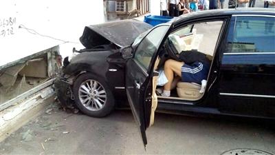 16时30分,记者赶到事发现场看到,轿车撞到一楼半地下室的窗户周围的墙上,两块玻璃被撞碎,轿车前灯和碎玻璃散落在地下室内的地面上。轿车内一名身着白色T恤的男子趴在车内方向盘上,额头和身上全是血,车内两个气囊弹出。车体前部完全变形,引擎盖凸起,地上散落着车体碎片。事故发生时地下室内没人。