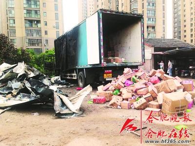 事发湖东新村东边的一条南北向的巷子内。记者赶到现场时,大火已经被扑灭,一整排板房全部倒塌。大货车头插在废墟中间,前半部分已经被烧毁,车厢中满载的乳制品饮料大部分散落在地上,靠近车头的饮料也变成灰烬。
