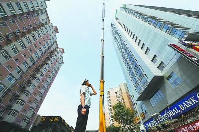 今天上午,记者在海淀区魏公街现场看到,重型吊车的吊臂有100余米长,可以直接够到写字楼的最顶层,吊车底座附近拉起了警戒线。“这处违建距离地面有100米,这个吊车最高能用到130米,将主要负责运送施工材料、清运渣土垃圾废料等。”海淀城管局紫竹院街道执法队副队长李松告诉记者,因为违建体量巨大,包括钢管等拆除后的废料从电梯间根本运不下来。“为了保证安全,光防护网我们就已经搭建了4天,共有上下两层,在四级风和雷雨天会停止施工作业,预计最快一个月内拆除完毕。”