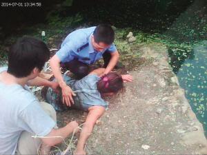 昨天13:20,正在值班的民警陈树松接群众报警称,在金旺佳园门口污水河桥墩上,有一女孩跳河,陈树松迅速赶往现场。赶到现场后,陈树松发现河中心一女孩正在水中喊救命,迅速跳入河中。由于河中都是生活垃圾和污水且有大量淤泥,没走几步就已过膝,他只好游向女孩。此时,女孩已沉入水中,只留双手挥舞。陈树松紧游几下,抓住女孩的手,就在这危急时刻,刚报警的市民高永祥再次返回,将一根木棍递给陈树松,陈树松一边抓着木棍,一边将女孩头部奋力托出水面。