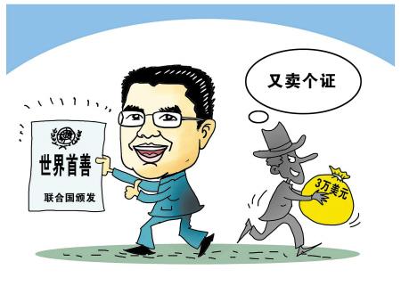 7月6日晚间,从美国归来后的陈光标接受采访时再三强调,“我现在是‘世界首善’了”,并展示了“联合国”颁布给其的“世界首善”证书。但联合国官方微博指出证书上“联合国”英文拼写错误。陈光标回应称,为获证书赞助了3万美元,可能是受骗了。(7月8日《东方早报》)