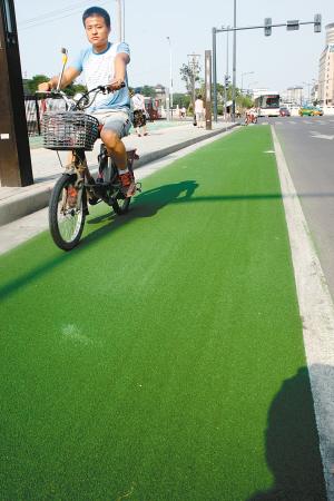 近日,环城南路、东大街等新建市政道路的慢车道一改往日传统的黑色沥青色,采用新颖鲜艳的绿色沥青铺装路面。不少市民反映,大夏天骑车行驶在彩色的路上,心情也会分外清爽。