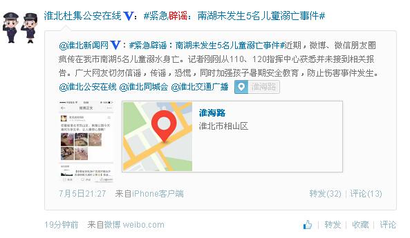 7月5日晚,淮北新闻网微博称,“记者从110、120指挥中心获悉并未接到儿童溺亡的相关报告,希望广大网友切勿信谣、传谣、引起恐慌,并呼吁加强孩子暑期安全教育,防止伤害事件的发生”。随后,淮北市公安局杜集分局官微转发也转发该微博进行辟谣。
