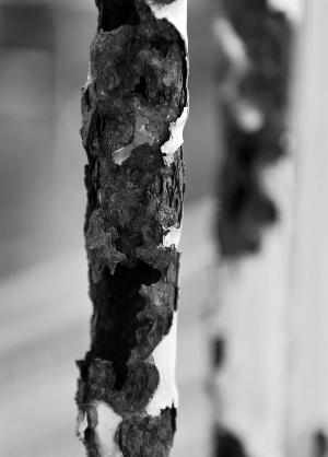 记者7日傍晚在海新大桥散步时发现,主桥桥面铁护栏锈迹斑斑,仔细看,锈蚀地方碎裂,很多地方都烂到洞穿,铁制的栏杆脆得用手就能掰碎。415米长的主桥两侧栏杆全部锈蚀。