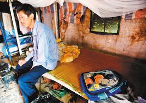 在李师傅居住的工棚里,孩子的书包还在床边,孩子是6月28日放暑假后才来到父亲身边的。翟小雪 摄