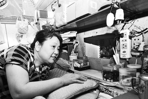 小卖部面积只有十余平方米,被“L”形货架隔成了两个部分:前面是经营区,日用百货、烟酒小吃等将货架塞得满满当当,再加上一副柜台、一台冰柜和一把椅子,十分逼仄;后面专门辟出位置,摆着一张小床,王振菊就躺在上面,旁边放着她的轮椅和洗漱用品等。