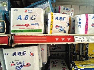 昨日,大兴大臧村超市货架出现的山寨商品:外包装神似七度空间卫生巾的“九度空间”、神似ABC卫生巾的“ABG”及“海乙丝”洗发水。新京报记者 周岗峰 摄