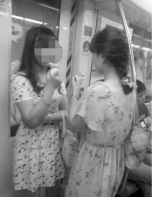 昨天中午,记者在西安门乘坐了地铁二号线,在车厢内,两位女士正边吃着甜筒冰激凌边聊天。穿过几节车厢,记者又发现一位男士手捧了一杯外带咖啡,一边玩着手机一边喝咖啡。