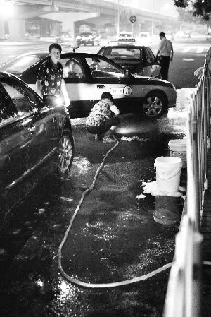 记者以洗车为名与其交谈,得知二人为夫妻,长期在此以偷绿化队浇灌用水给过往车辆洗车谋生,来此洗车的以跑夜活的出租车为主,其中有不少是回头客。一小时内,他们前后共洗了六辆车,据该女子介绍,平均每晚都能洗到三十多辆。