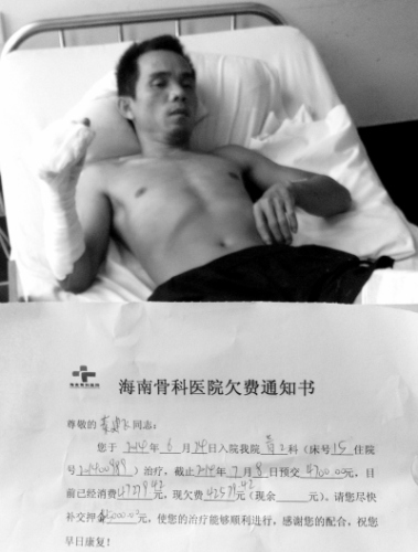 “如果当时我躲在屋里不出来,或者从旁边的门溜走,也不可能被他们砍伤。”昨日,躺在病床上的秦建飞看着手中的欠费通知单,一脸茫然。据悉,6月24日,秦建飞在临高临城镇一香蕉园里被人砍成重伤,他是为了阻止歹徒行凶、营救老板才挨了刀,老板因伤不治身亡,他不知该找谁讨要医疗费。与秦建飞有同样遭遇的还有另一名工人。记者昨日从临高警方获悉,该案仍在进一步侦办中。