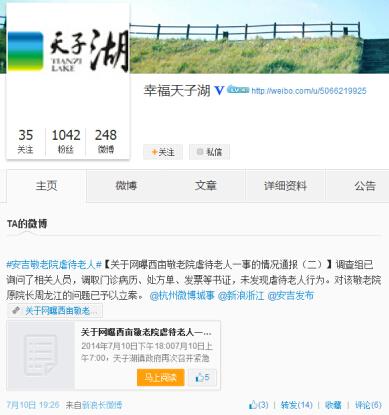 日前,网上消息称“浙江省湖州市安吉县天子湖镇西亩敬老院虐待老人”,此事引起社会广泛关注。昨日,天子湖镇官方微博通报了调查结果称未发现虐待老人行为,对该敬老院原院长周龙江的违规问题已予以立案。