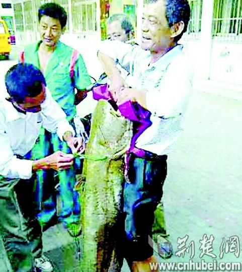 邵先生家住汉阳电厂附近,是30多年的老钓客,平常只钓深水鱼。前日下午4时,他像往常一样在汉南小军山江边钓鱼。突然,鱼钩被拽了一下,有鱼上钩。他赶紧收线,发现异常吃力,“拉起来才知道鱼有这么大。”