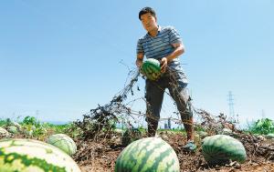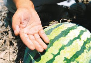昨日下午2时,记者来到这片西瓜地。火辣辣的太阳底下,整个西瓜地到处都是干枯的瓜秧,满地的西瓜裸露在外,大小不一,50岁的王敏和37岁的白永帅正在西瓜地里做“抢救”工作。但是真正“抢救”过来的并不多,一旦发现还有能吃的西瓜,就赶紧收集起来放在一起,“没办法,能卖一个是一个,尽量减少损失。”拔起一棵枯死的瓜秧,看到瓜秧的根部还是湿的,白永帅觉得很可惜,“你看看,这根儿都好好的,瓜秧却被石灰烫死了。”