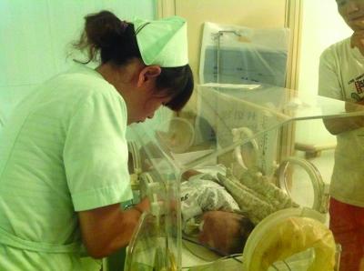 南京儿童医院,护士将萱萱放入暖箱。
