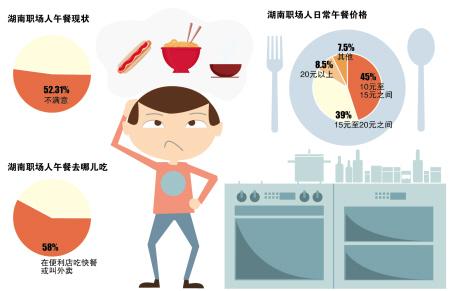 参与此次调查的总人数为130万,其中有近5万名湖南职场人。全国总体数据显示,对午餐现状表示“不满意”的职场人高达8成。与之相比,湖南的数据要低一些,有52.31%的人表示“不满意”。