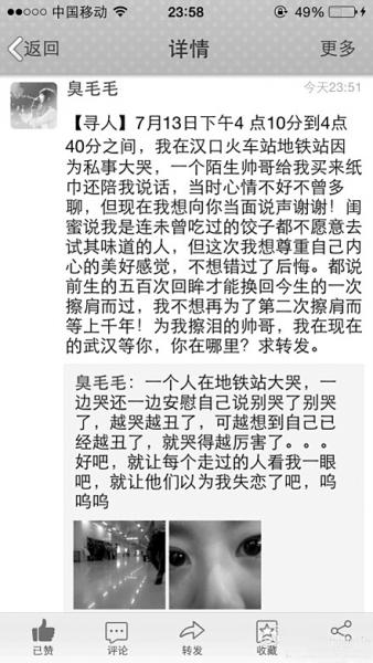 新浪微博@EiffelStephanie:万能的微博,麻烦帮忙找一个人。7月13日下午4点到5点之间,在汉口火车站地铁站,帮大哭的妹纸买来纸巾还陪她聊天开导她的那个有爱帅哥!那大哭妹纸是我闺蜜,世界这么大,能遇见不容易,我希望闺蜜这一次的勇敢,能够得到成全。各路小伙伴,求帮转!