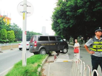 昨日上午11点45分,在金鸡山隧道口执勤的茶园派出所民警,突然听到“砰”的一声巨响。民警转身后看见一部小面包车冲上路边花圃,接着将花圃旁的护栏撞倒。面包车悬在花圃和护栏上,前引擎盖被撞掀起。