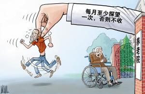 养老院设立“每月探望一次”的底线,折射的是现实的无奈,尴尬的是整个社会。“常回家看看”已入法,要让子女孝敬老人不成为问题,家庭教育、社会引导、道德劝勉、法律护航都不可缺位。(文\刘庆传 图\罗杰)