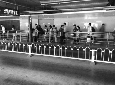 北京南站的地下一层,有站方设立的正规出租车等候区,在东、西两侧的停车场,各有一个。每个等候区,又各有一南一北两个出入口。在这4个出入口,都有黑车司机揽客。