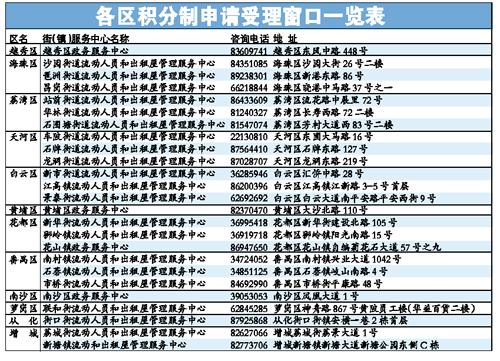 今年的积分制入户工作改由居住地受理。申请人可在所居住的区(以办理《广东省居住证》为准),就近选择受理窗口递交纸质材料。在十个城区就业而在从化市或增城市居住的申请人,可在从化市或增城市的受理窗口申请,待申请审核通过后,在十个城区选择符合规定的地址落户。