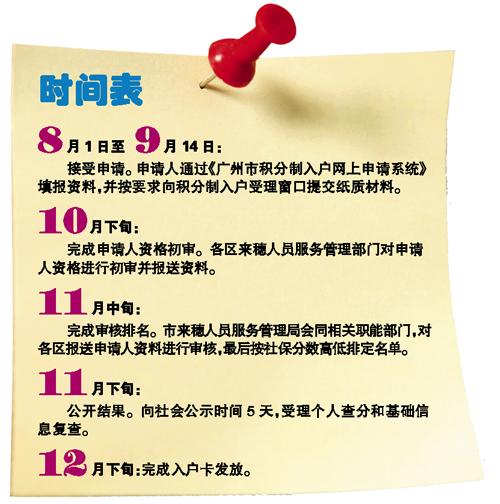 2014年广州市积分制入户工作正式启动,15条实施细则新鲜出炉。昨天,广州市政府通报,今年积分制入户指标总量为3000个,由新成立的广州市来穗人员服务管理局负责统筹协调和具体实施,于8月1日至9月14日在全市25个来穗人员服务窗口正式接受申请。